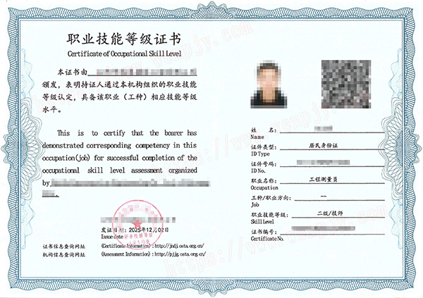 考试合格,颁发《工程测量员---四级(中级工)、工程测量员---三级(高级工)、工程测量员---二级(技师)、工程测量员---一级(高级技师)》证书。证书官网电子注册,可作为专业技术人员相关职业能力考核的有效证明。