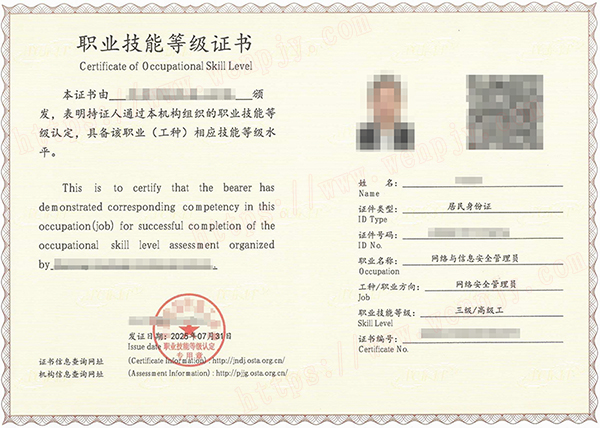 考试合格,颁发《网络与信息安全管理员---三级(高级工)》职业技能等级证书。证书官网电子注册,可作为专业技术人员相关职业能力考核的有效证明。